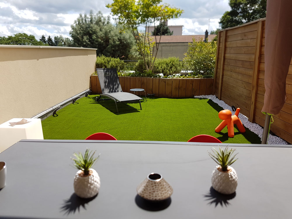 Amenagement rez de jardin Une Terrasse comme un petit coin de Paradis " Une Invitation à la détente " Pose de gazon synthétique Réaménagement végétal d'un bac existant Avant Après Apres